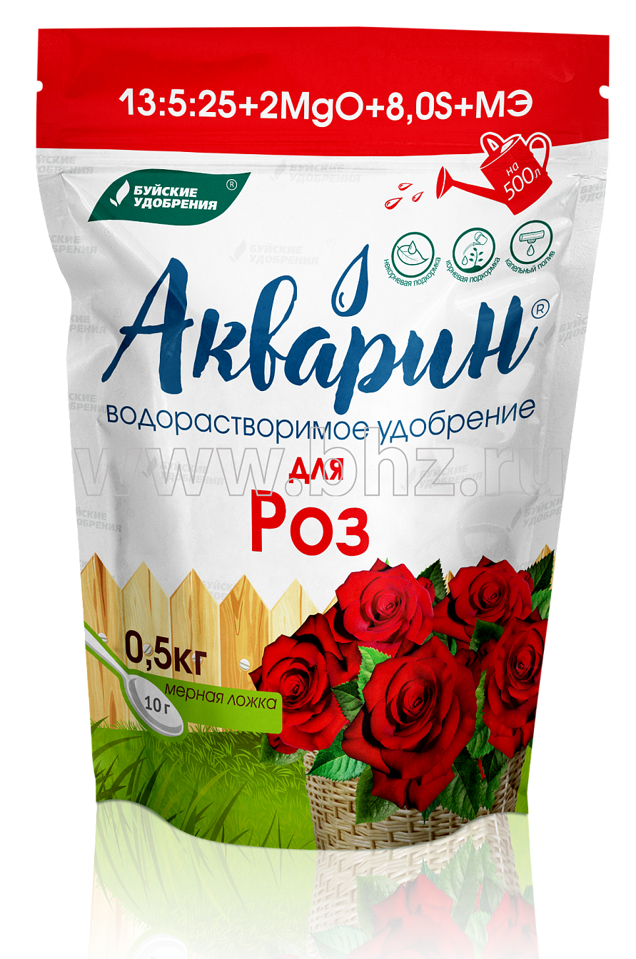 Акварин для роз - водорастворимое удобрение, в состав которого входит азот, фосфор, калий, магний, сера и микроэлементы - железо, цинк, марганец, медь в хелатнойформе, а бор и молибден - в минеральной. Благодаря кислой реакции (pH) удобрения, оно легко растворяется в холодной воде и более эффективно усваивается корневой системой или листовой поверхностью растений.