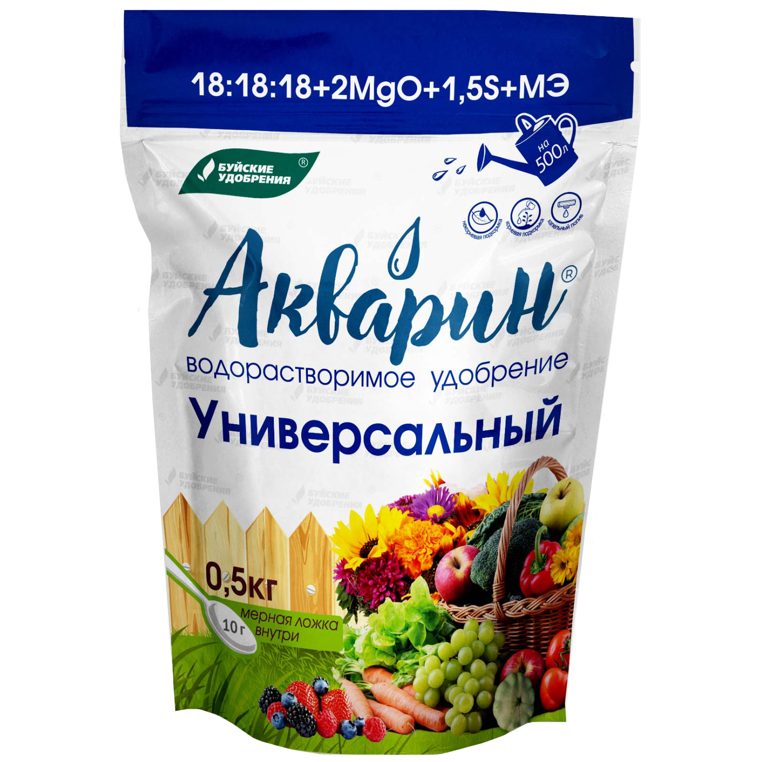 Акварин Универсальный - водорастворимое удобрение, в состав которого входит азот, фосфор, калий, магний, сера и микроэлементы – железо, цинк, марганец, медь в хелатной форме, а бор и молибден – в минеральной. Благодаря кислой реакции (рН) удобрения, оно легко растворяется в холодной воде и более эффективно усваивается корневой системой или листовой поверхностью растений.